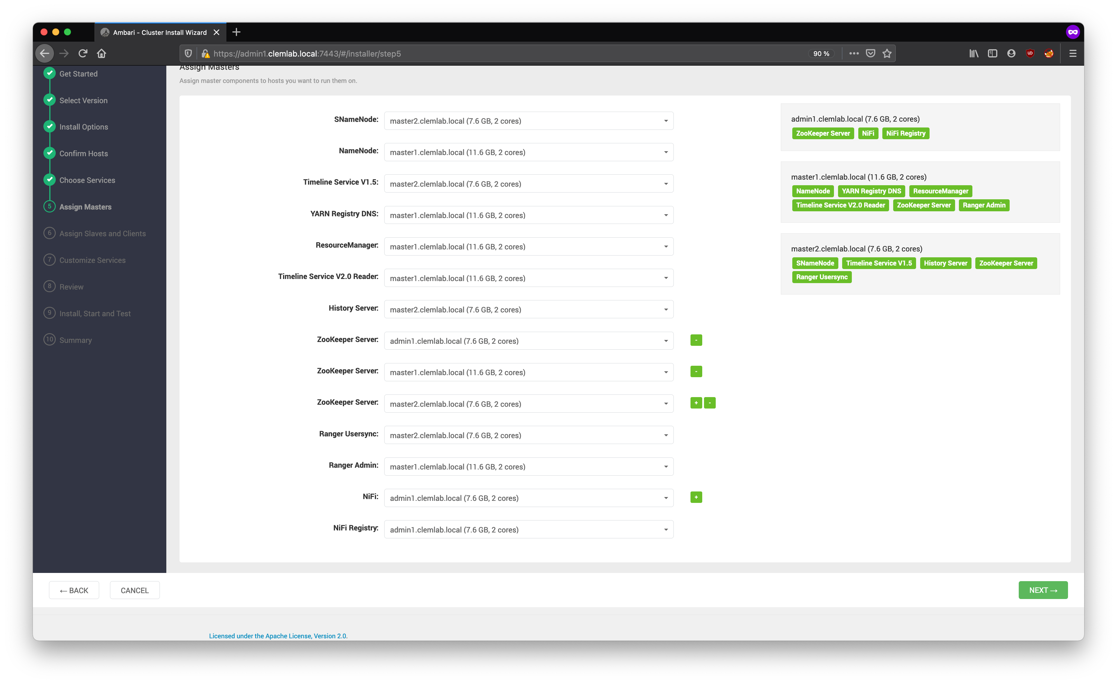 L'assistant d'installation du cluster attribue les composants maîtres des services sélectionnés aux hôtes appropriés de votre cluster et affiche les affectations dans Assign Masters.