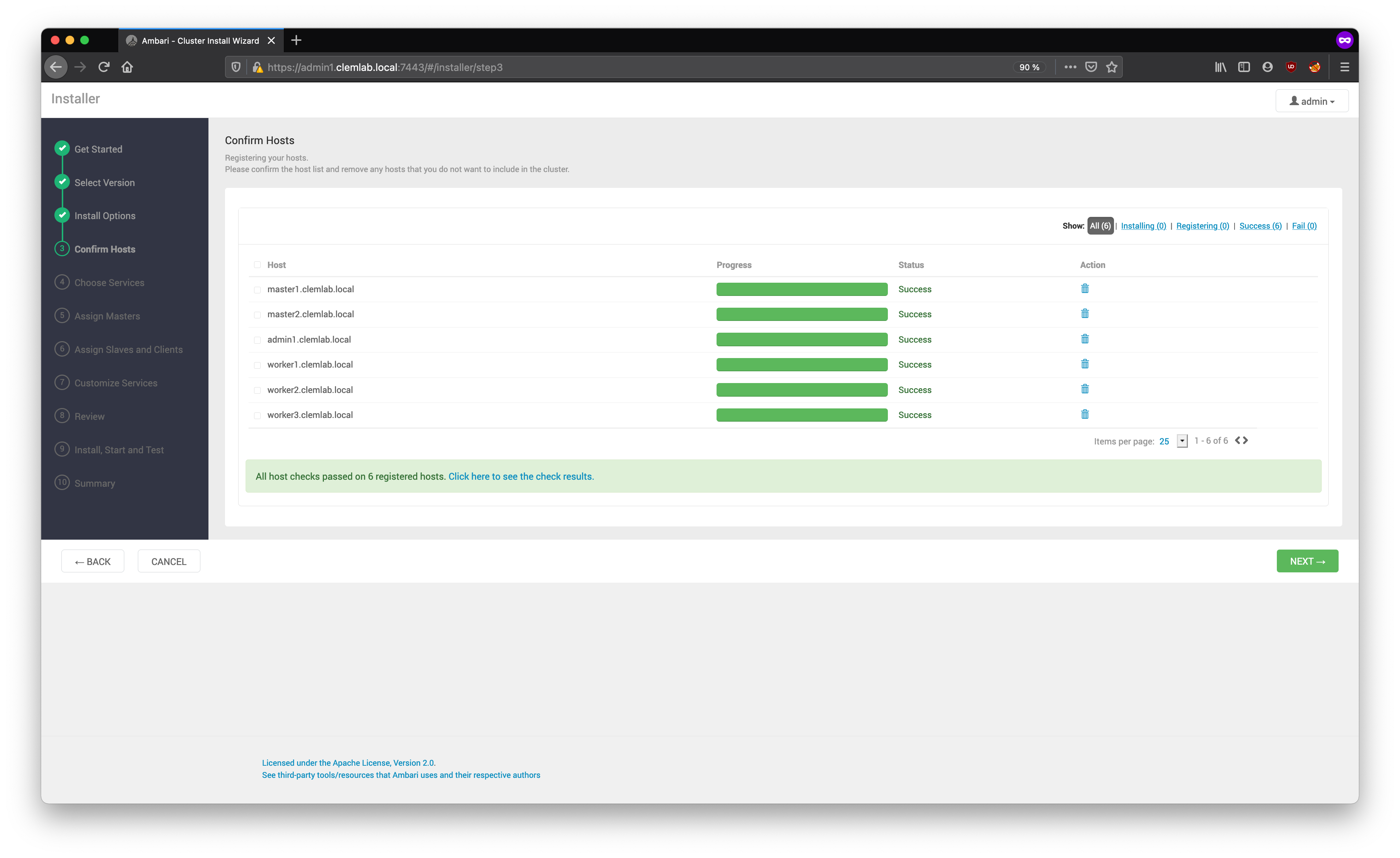 Confirm Hosts vous invite à confirmer qu'Ambari a localisé les hôtes corrects pour votre cluster et à vérifier ces hôtes pour vous assurer qu'ils disposent des répertoires, packages et processus appropriés requis pour poursuivre l'installation.