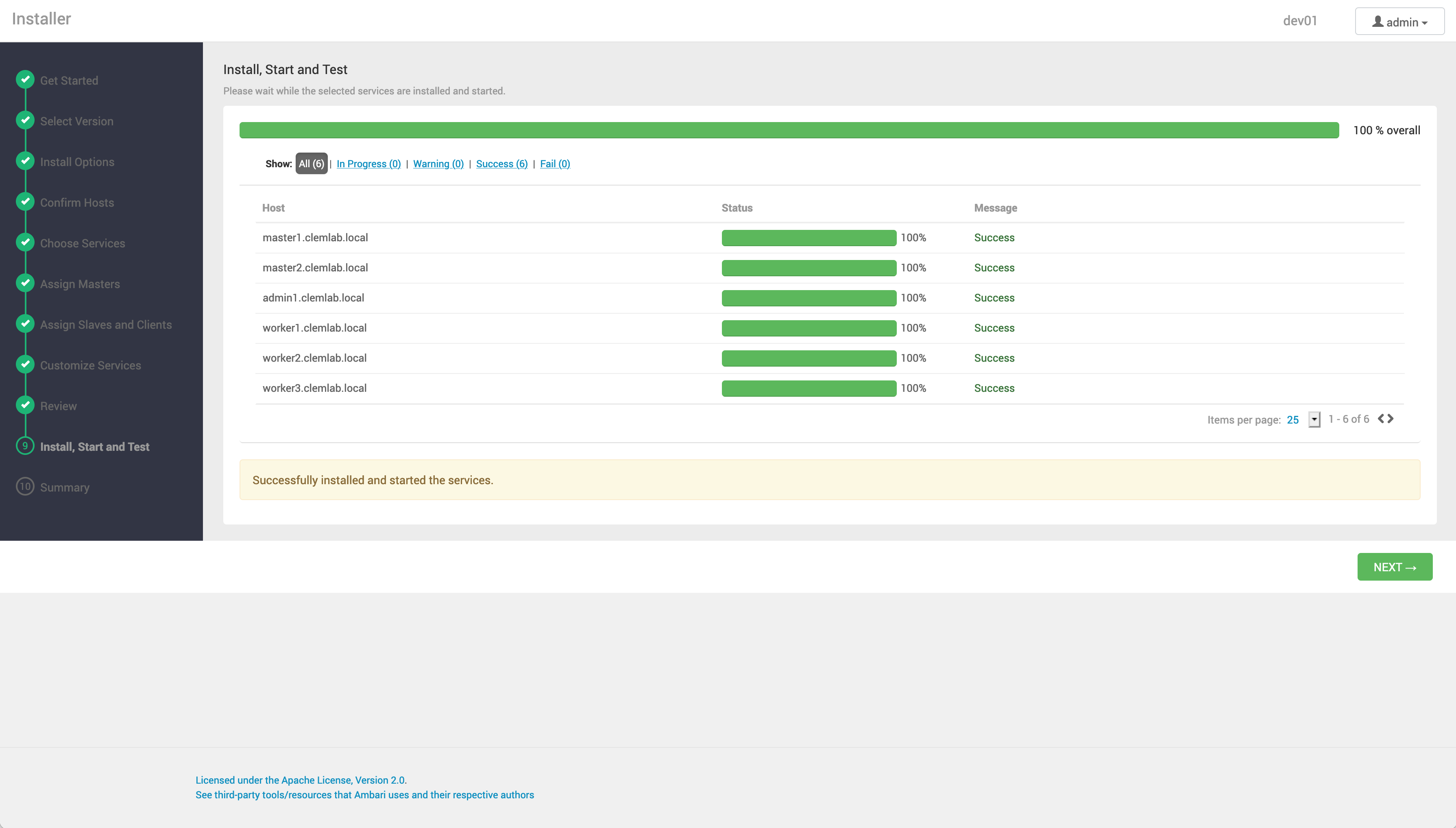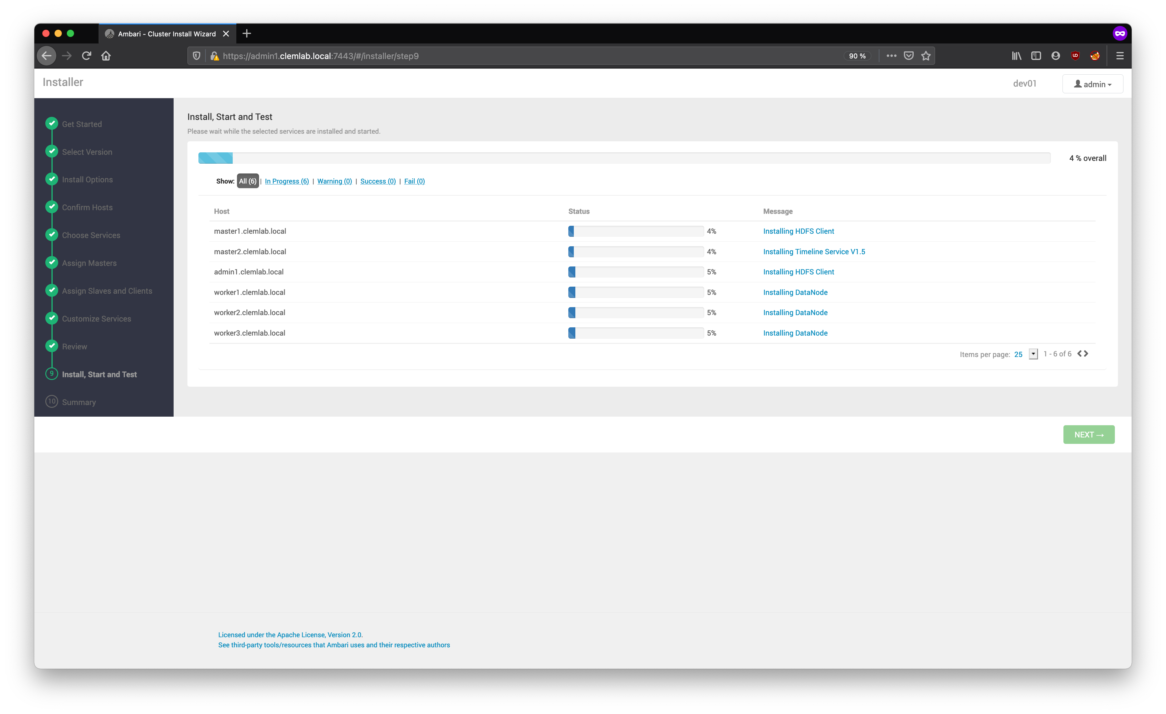 La progression de l'installation s'affiche à l'écran. Ambari installe, démarre et exécute un test simple sur chaque composant. L'état général du processus s'affiche dans la barre de progression en haut de l'écran et l'état hôte par hôte s'affiche dans la section principale. N'actualisez pas votre navigateur pendant ce processus. L'actualisation du navigateur peut interrompre les indicateurs de progression.